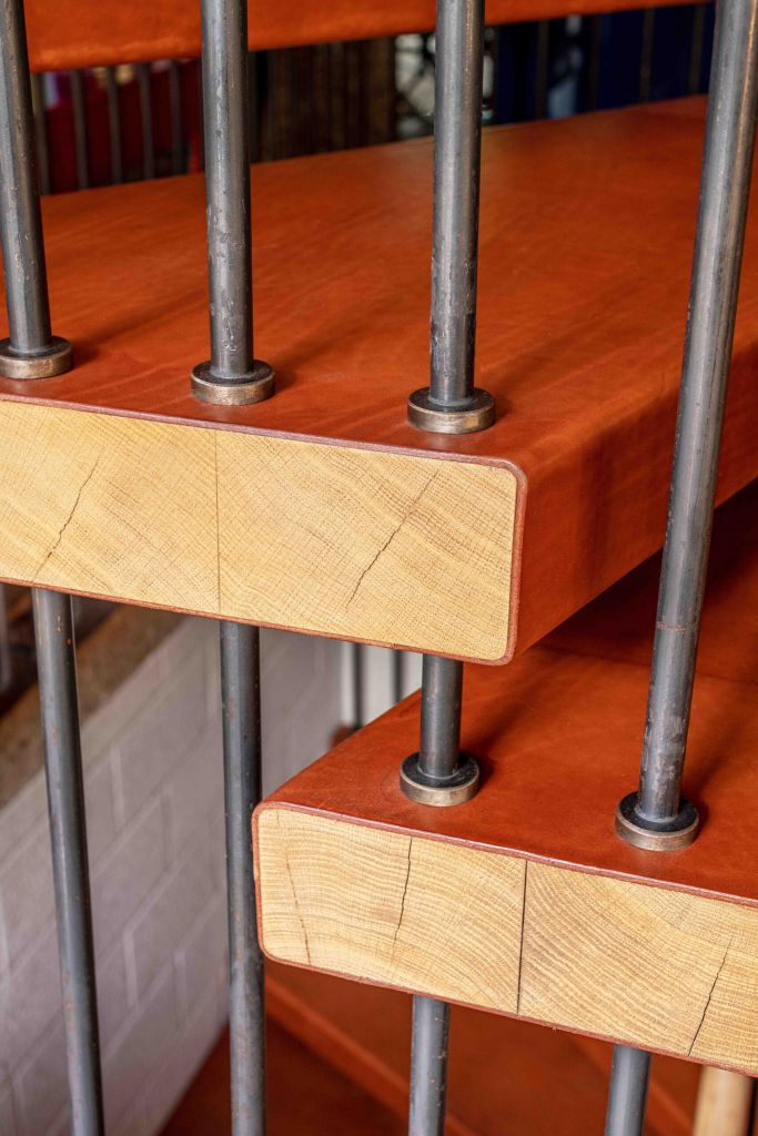 Đây là thiết kế trong dinh thự của một gia chủ rất am hiểu về da. Anh lựa chọn loại da thuộc thực vật cho thiết kế cầu thang gỗ này. Tác động của lực, mồ hôi cơ thể, ánh sáng mặt trời,... dần dần tạo nên nét độc đáo trên bề mặt của thiết kế sau một thời gian sử dụng.