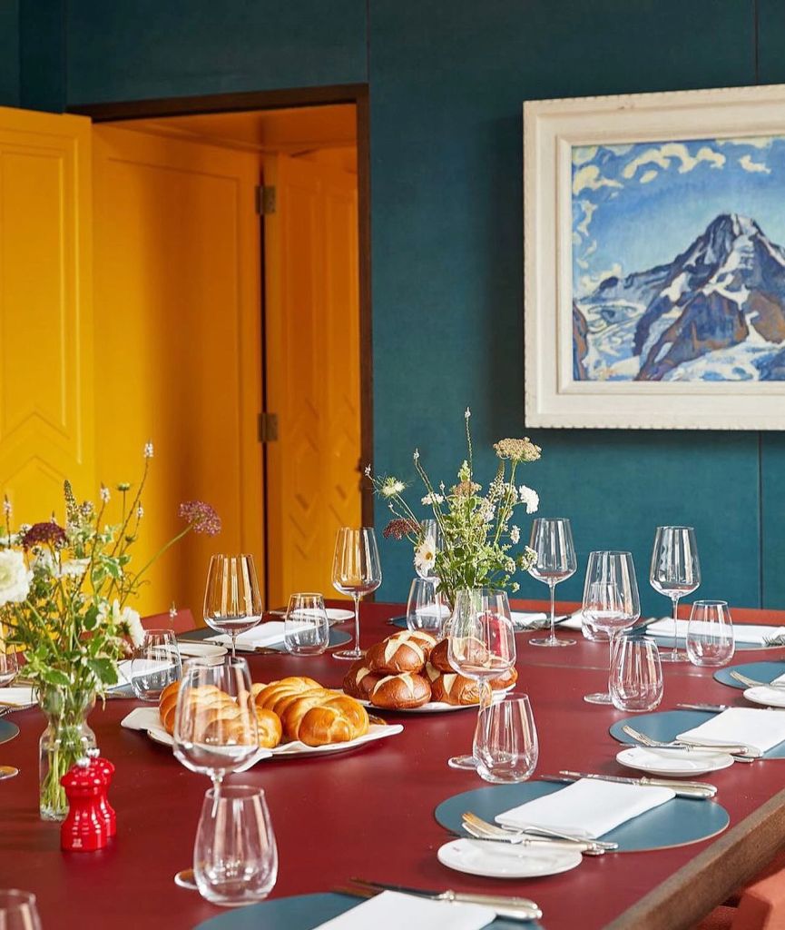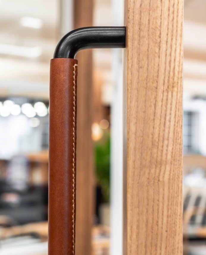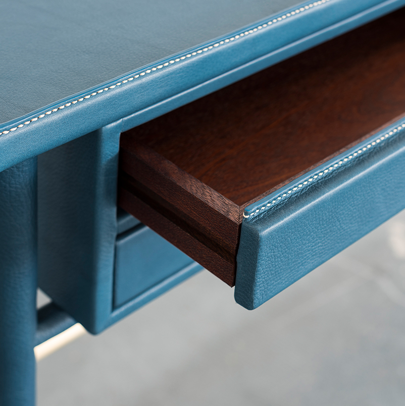 Để bọc lên bề mặt bàn, đội ngũ thiết kế đã lựa chọn những tấm da ở phần vai của những con bò Ý và thuộc bằng chất thuộc thực vật (thuật ngữ trong ngành gọi là Vegetable tan). Theo thời gian, loại da này được các nhà thiết kế cho rằng sẽ tạo nên hiệu ứng độc đáo cho mặt bàn. Bên cạnh đỏ, sắc đỏ là lựa chọn thông minh cho nhà hàng vì nó khơi gợi được sự thèm ăn của thực khách.