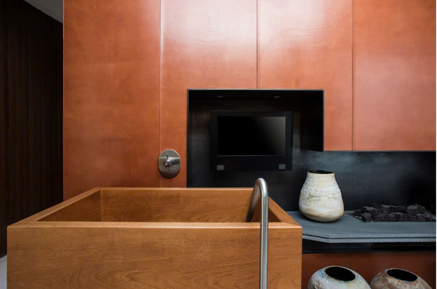 Nhà thiết kế Pip Horne đã lựa chọn da cho thiết kế ốp tường trong phòng tắm của khách hàng. Sau nhiều năm sử dụng, lớp thuộc da truyền thống từ vỏ cây sồi đã chuyển sang màu nâu vàng đậm, làm nổi bật tông màu lạnh của lớp bê tông phía dưới một cách đẹp mắt.